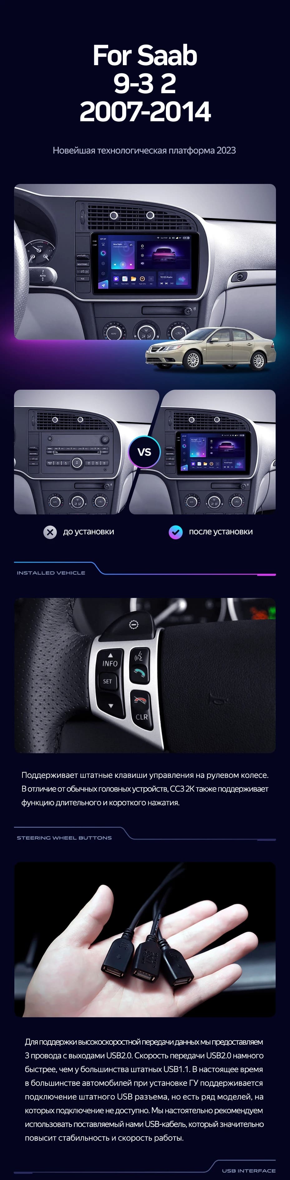 Полный комплект установки магнитолы Teyes с рамкой и проводкой можно выбрать в каталоге штатных магнитол Saab 9-3 2 (2007-2014).