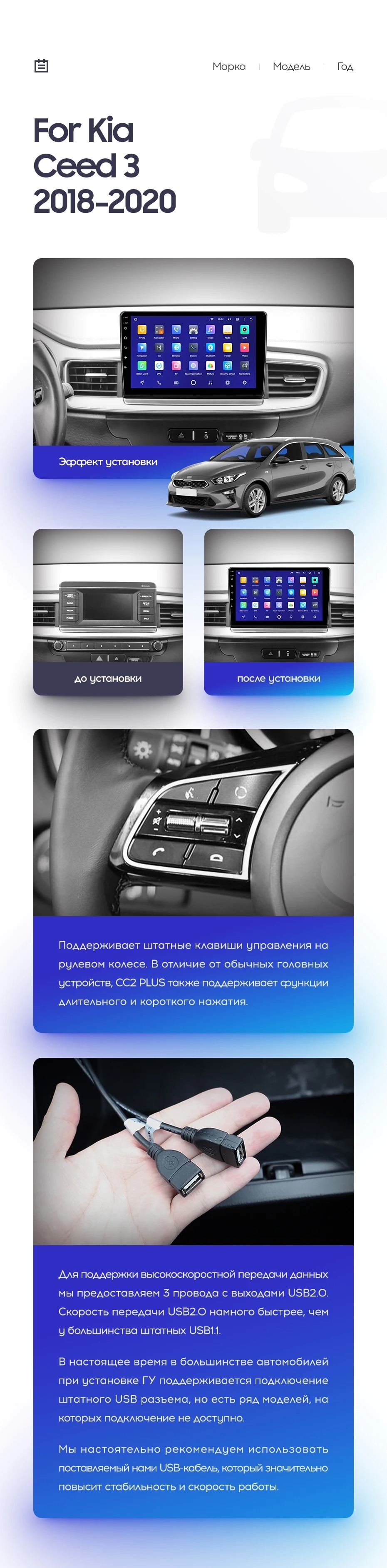 Полный комплект установки магнитолы Teyes с рамкой и проводкой можно выбрать в каталоге штатных магнитол Kia Ceed 3 CD (2018-2020).