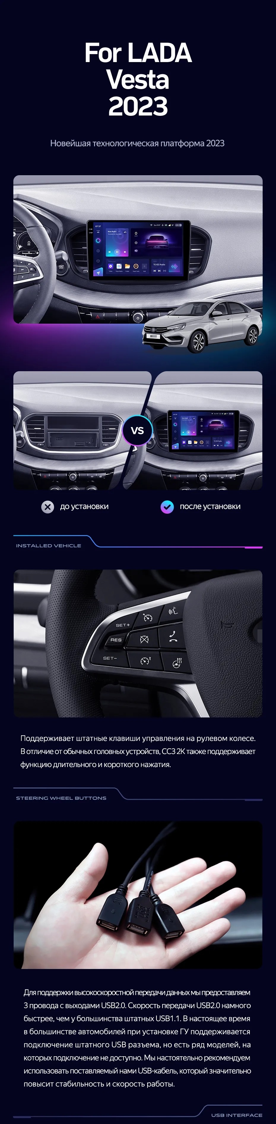 Полный комплект установки магнитолы Teyes с рамкой и проводкой можно выбрать в каталоге штатных магнитол LADA Vesta 2023+.